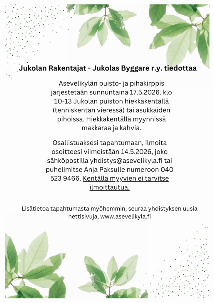Tarkempi ohjelma ja mahdolliset lisätiedot julkaistaan myöhemmin. Päivä kannattaa kuitenkin jo nyt merkitä kalenteriin ja tulla mukaan viettämään mukavaa perhepäivää Asevelikylässä